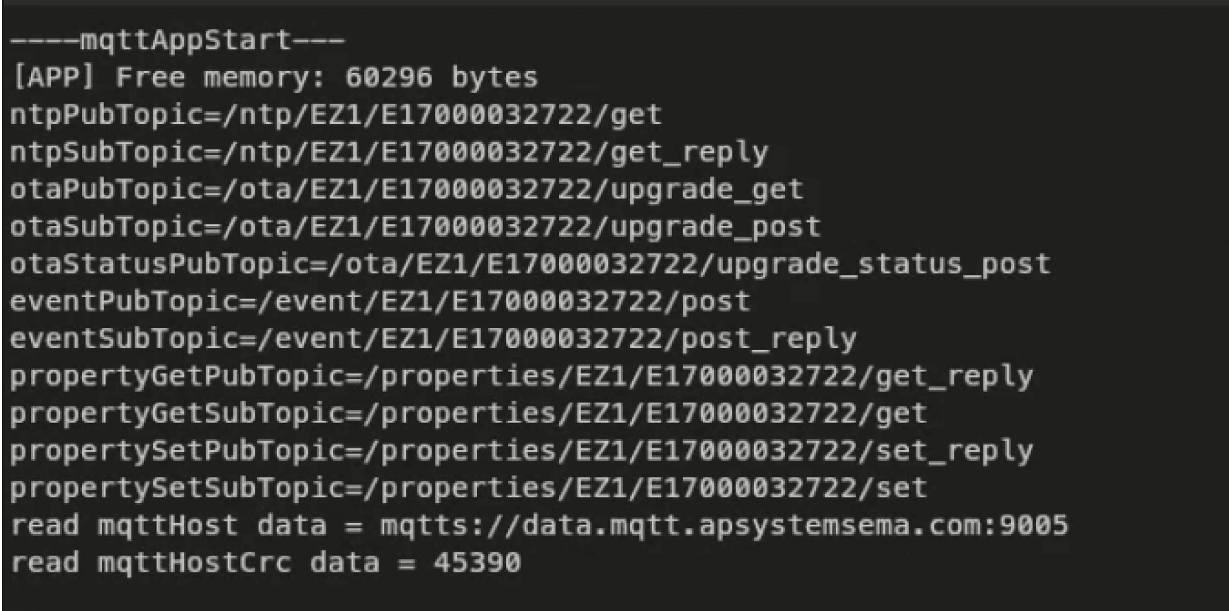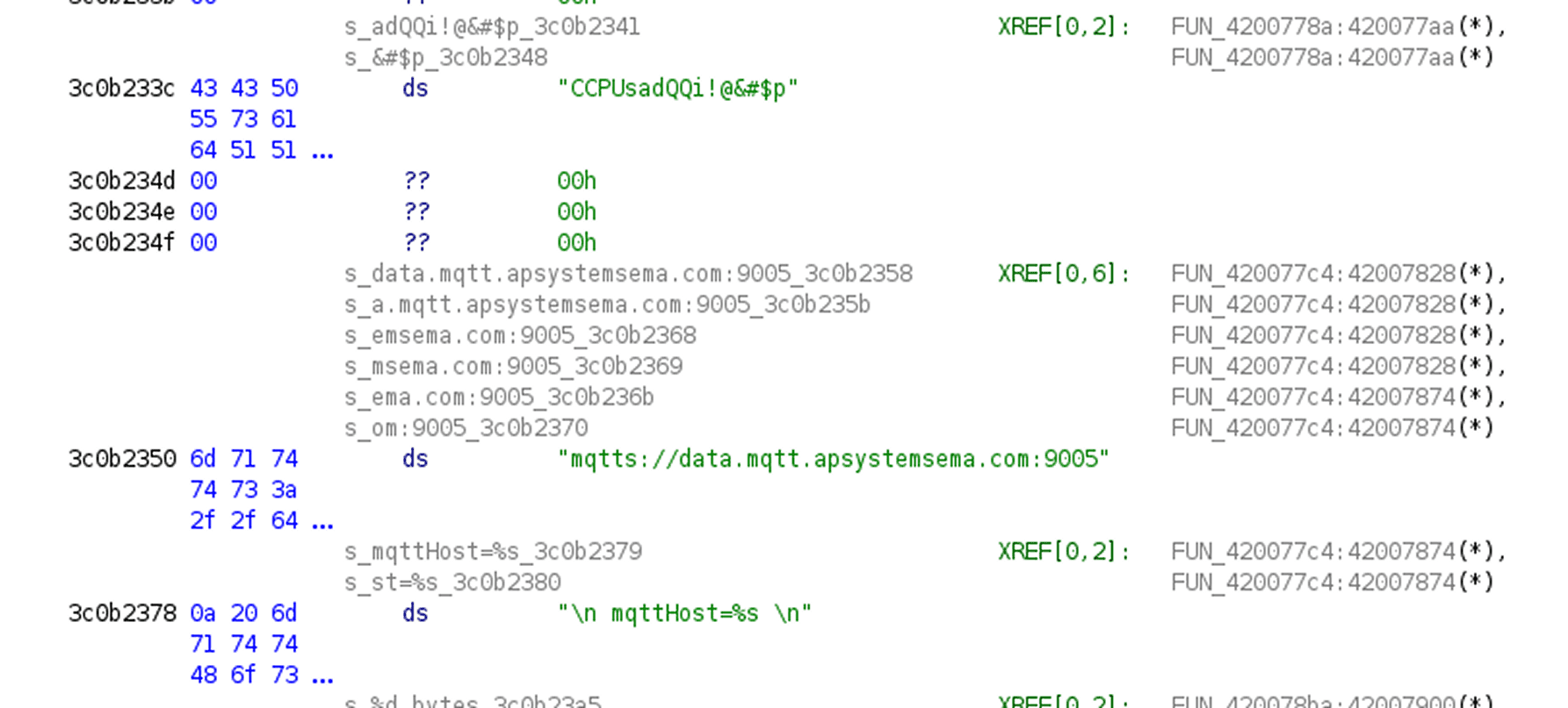 Using Ghidra to analyze the firmware, we found out the MQTT broker URI being used was data.mqtt.apsystemsema.com:9005. In the function where this string was referenced, we also found two random strings: uh345IeTf)(&*rrr and CCPUsadQQi!@&#$p. Initially, we thought these were the MQTT credentials, but connection attempts were unsuccessful.