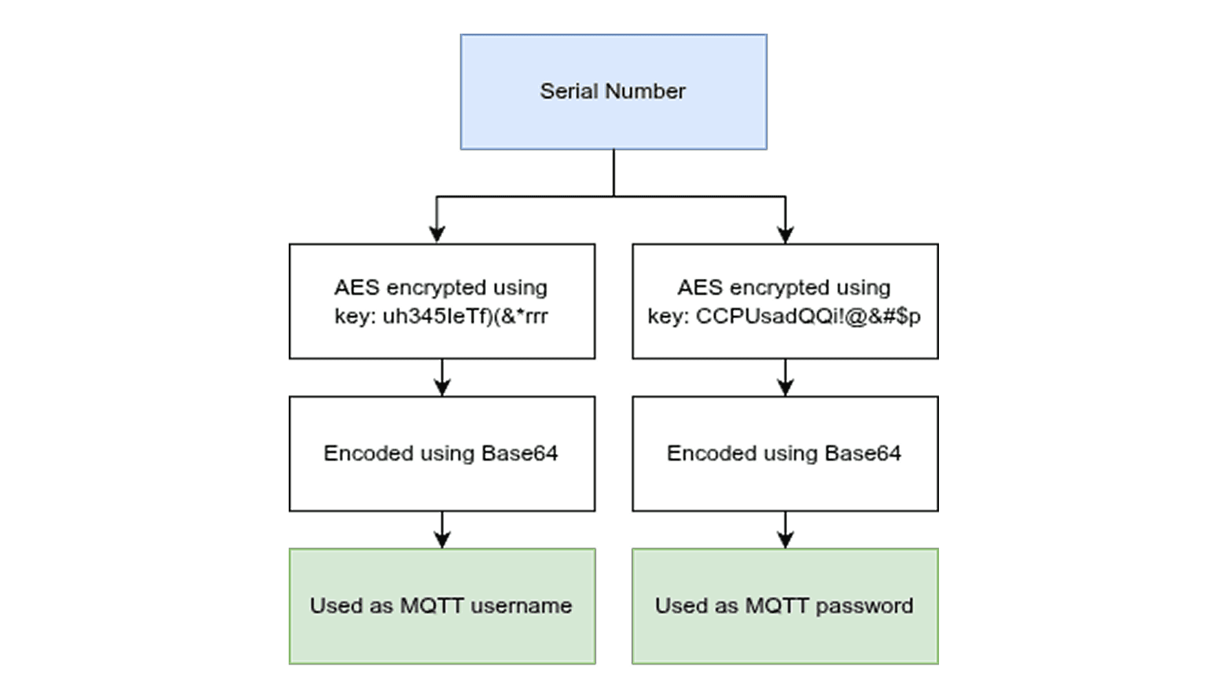 First, the serial number of the device is encrypted using the strings mentioned above. Once for the username and a second time (using the second string) for the password. Afterwards, the encrypted blobs are encoded using Base64 and used as MQTT credentials.