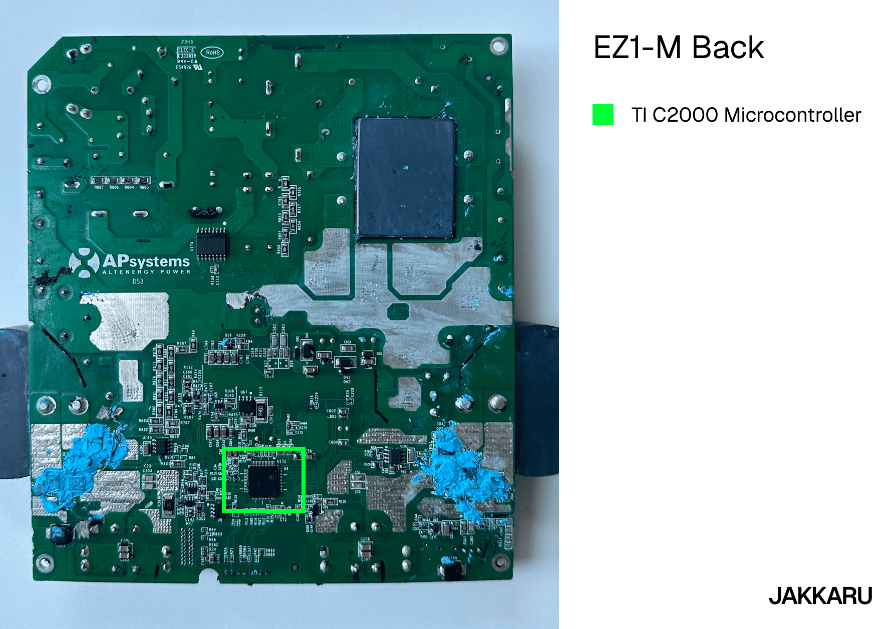 The back view reveals a TI C2000 microcontroller, which is connected to the ESP32C2 and controls the gate drivers. These are responsible for the DC-to-AC conversion process. Below the APsystems logo, the text “DS3” can be seen, suggesting the EZ1-M uses the same hardware as the DS3 inverter series.